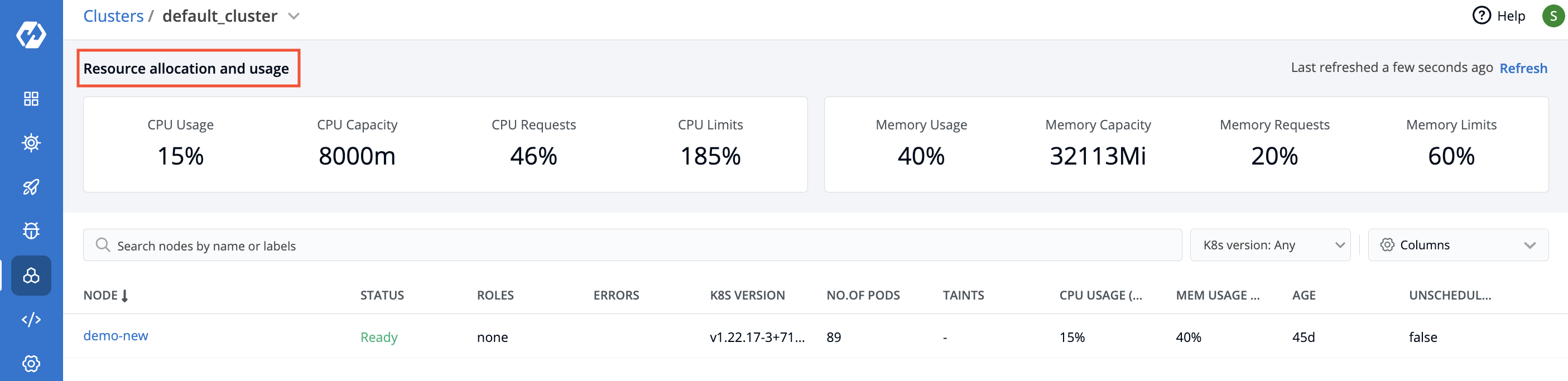 | 22 | +To see the details of resource allocation and usage of the cluster, click the particular cluster. |