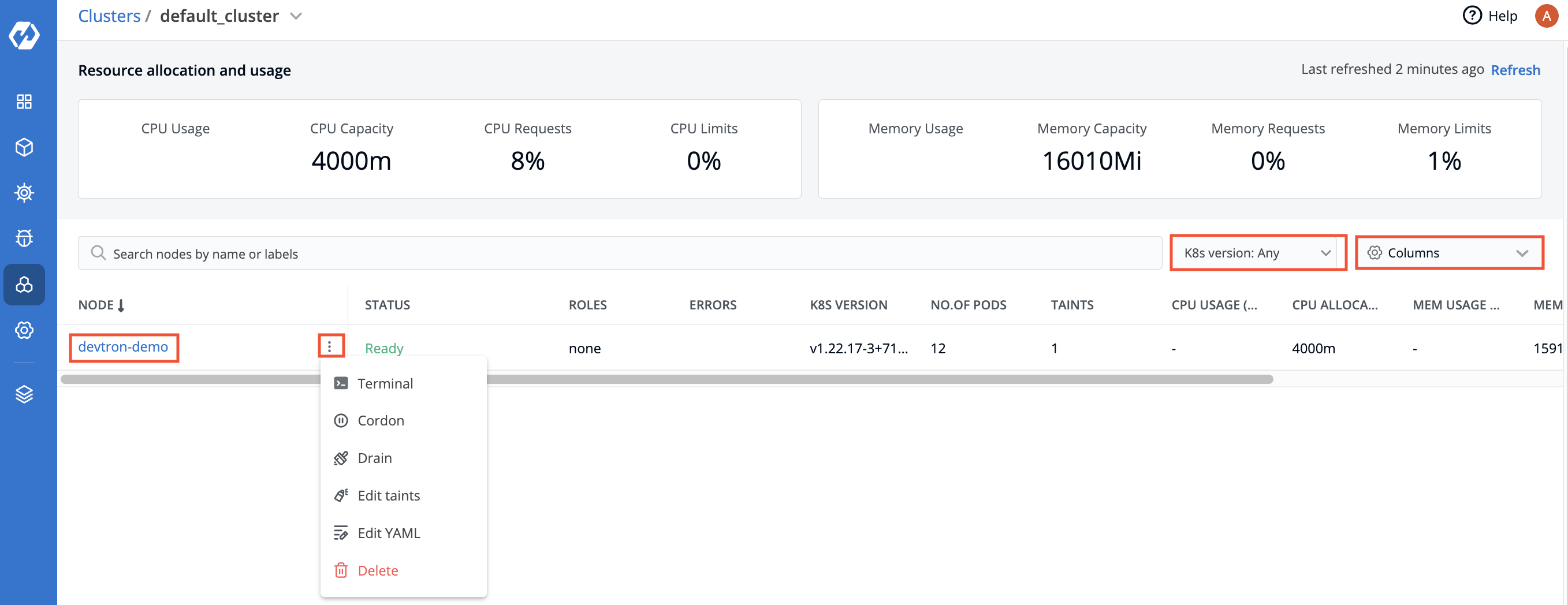 | * A dialog box with message `Cordoning this node will mark this node as unschedulable. By cordoning a node, you can be sure that no new pods will be scheduled on this node` is displayed. | ||