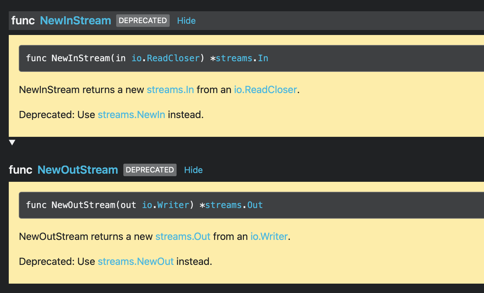 cli/command: fix deprecation comments for Stream types #4152