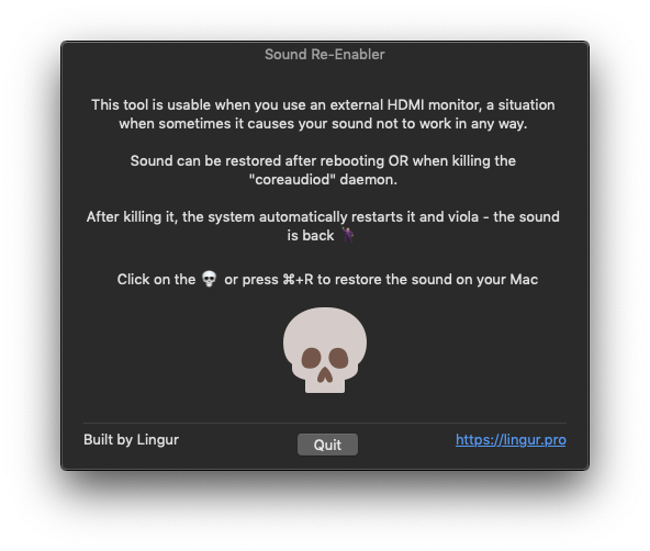 After clicking on the Skull, the app kills coreaudiod, and the system automatically restarts the daemon afterwards, and your sound is back to normal 🎼