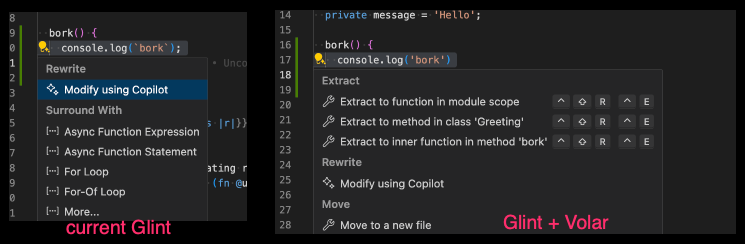 - Either you use "takeover" mode (disabling vanilla TS language server, using only a non-feature-complete Glint), or you run both TS and Glint servers, which has performance issues and awkward duplication of certain kinds of errors, completions, hints, etc.