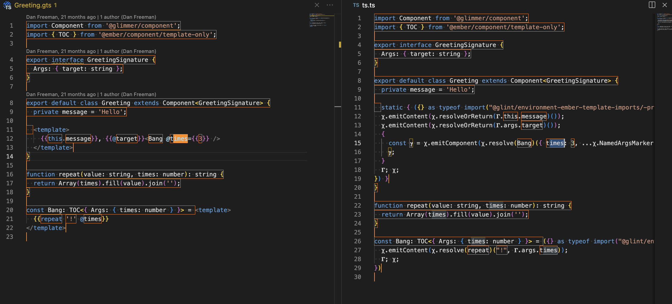 Ember avoids these issues by way of a novel `.gts` / `.gjs` file extension which does not trigger vanilla TS tooling. This will allow us to implement a TS Plugin to process the file "from scratch" so that there are no default TS errors / warnings to remove.