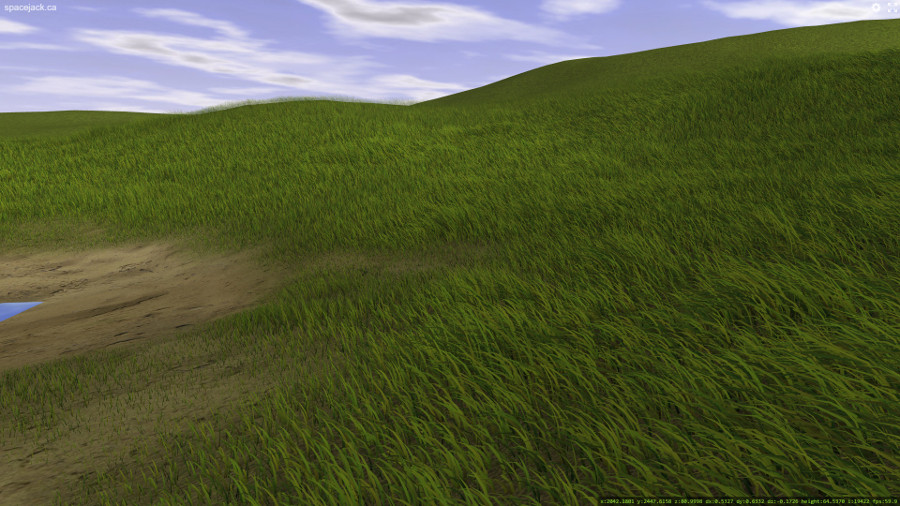 This is a followup to a previous experiment to render grass as geometry with a vertex shader. This demo adds terrain elevation, improved lighting, grass animation, wind, water and other details.