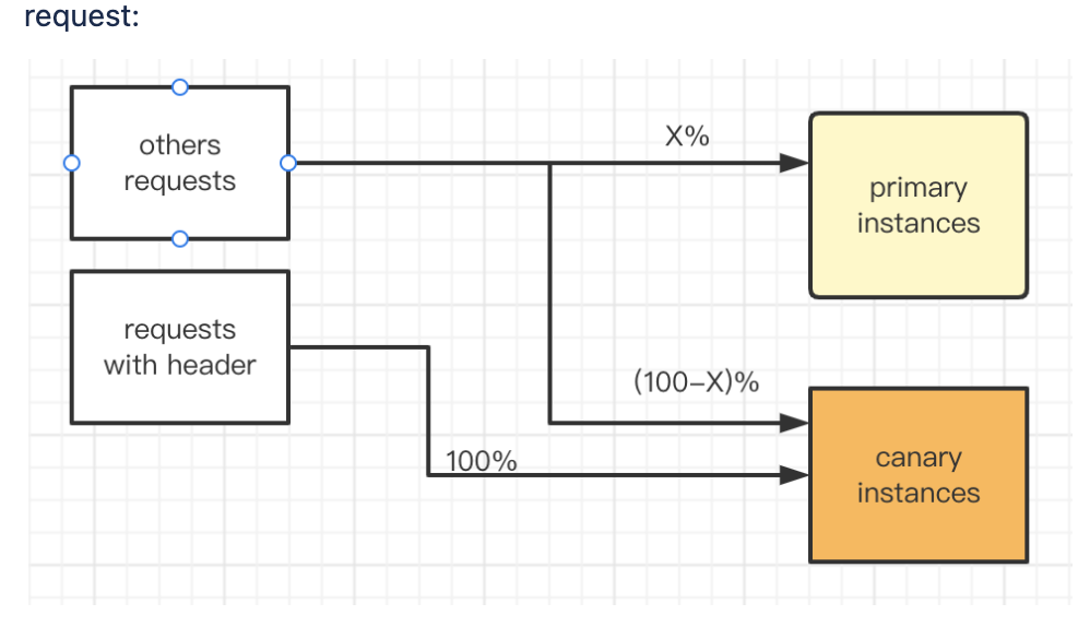 During canary deployment I want to add a policy of traffic forwarding based on header, that is access with header only to canary instance and others to primary and canary as follows.