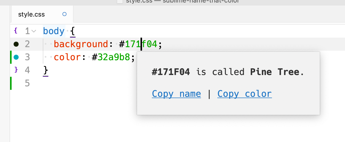 - Open the command pallete, run “Package Control: Install Package“, then search for “Name That Color“.