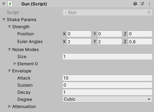 }If you need more options, than provided by presets, you need to create an instance of some shake class and pass it into the CameraShaker.Shake. There are three default shake classes: PerlinShake, BounceShake and KickShake. You can also write your own shakes. The example below is for PerlinShake.