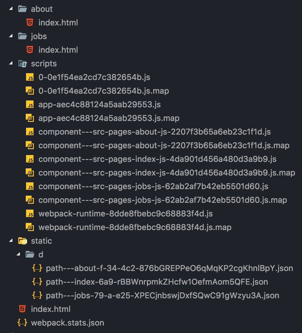 scriptsandstylesstems from the variables in the repository.public/ {page}/ scripts/ styles/ static/ index.html webpack.stats.jsonExample output based on "hello-world" gatsby v2