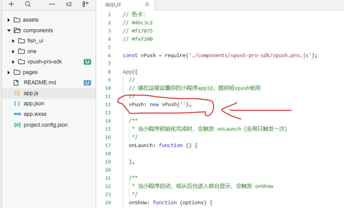 很简单!点击app.js进行编辑,然后在vPush的初始化操作里,输入你的小程序appId即可!