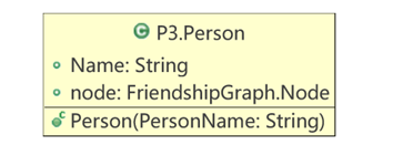 }- 该类的目标是将每一个人对应到一个Person对象,并存储名字的信息。此外,在我的设计中,为了方便起见,我将每个Person对象在FriendshipGraph中对应的Node存储在对应Person的成员变量中。