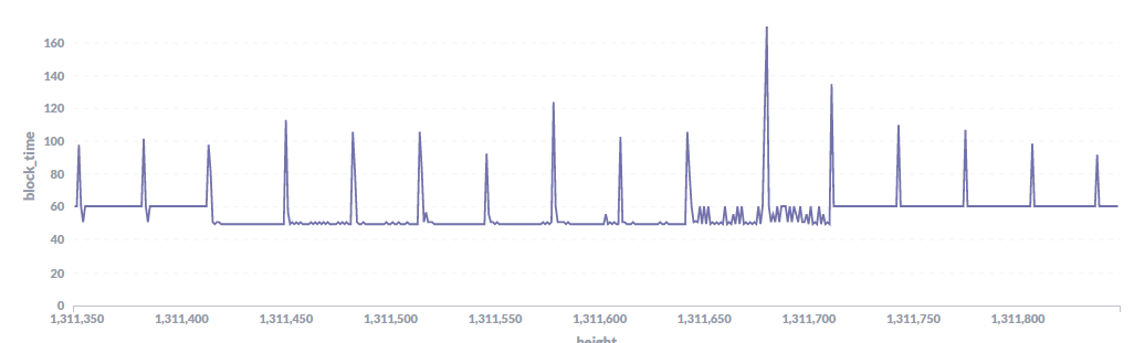 Second, because many validator do not store at least 50K of block history, calculations of the target block time will vary between validators. Currently, this variability results in 9 or 10 second discrepancies between validator which may be resulting in missed BBAs for validators assuming the block time should be longer than the majority. By having more steps in the catchup ramp curve, we will hopefully see smaller difference between validators when we do see discrepancies and thus fewer missed BBAs.