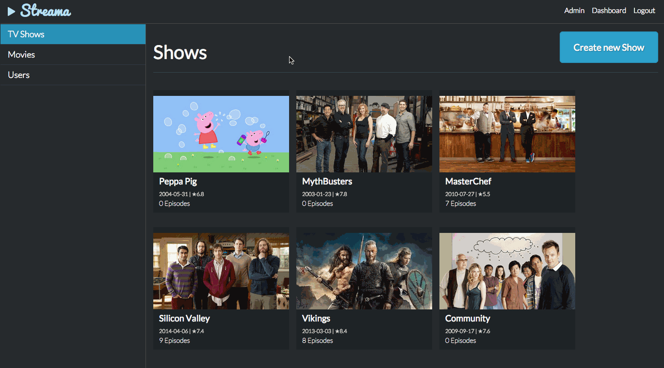 One of the most important things to me was to make managing shows, movies, and episodes as easy and fun as possible. For this, I made heavy use of the API from theMovieDatabase.org, which auto-fills the episodes, shows and movies with useful information and great images. This eases the user's role in adding content.