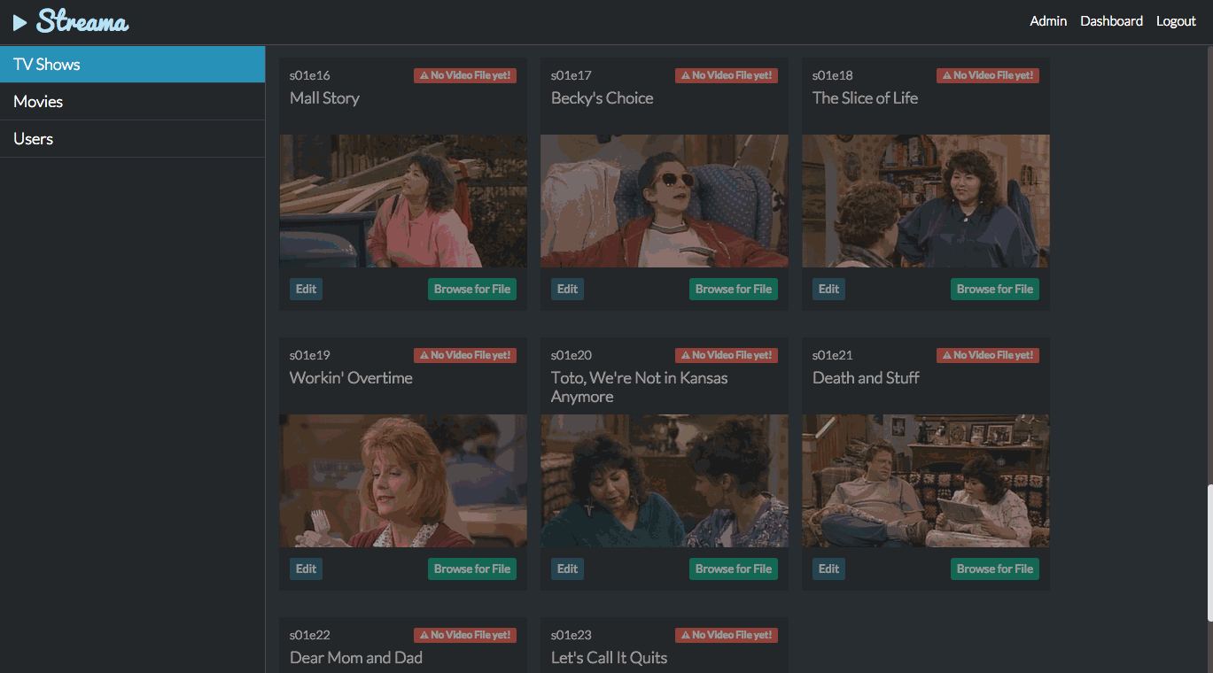 Ever had a huge bookshelf full of shows and movies? Ever wanted to digitalize them, but didn't have a good way of organizing the files? Worry no more! Streama is your own personal Netflix for just such a purpose!