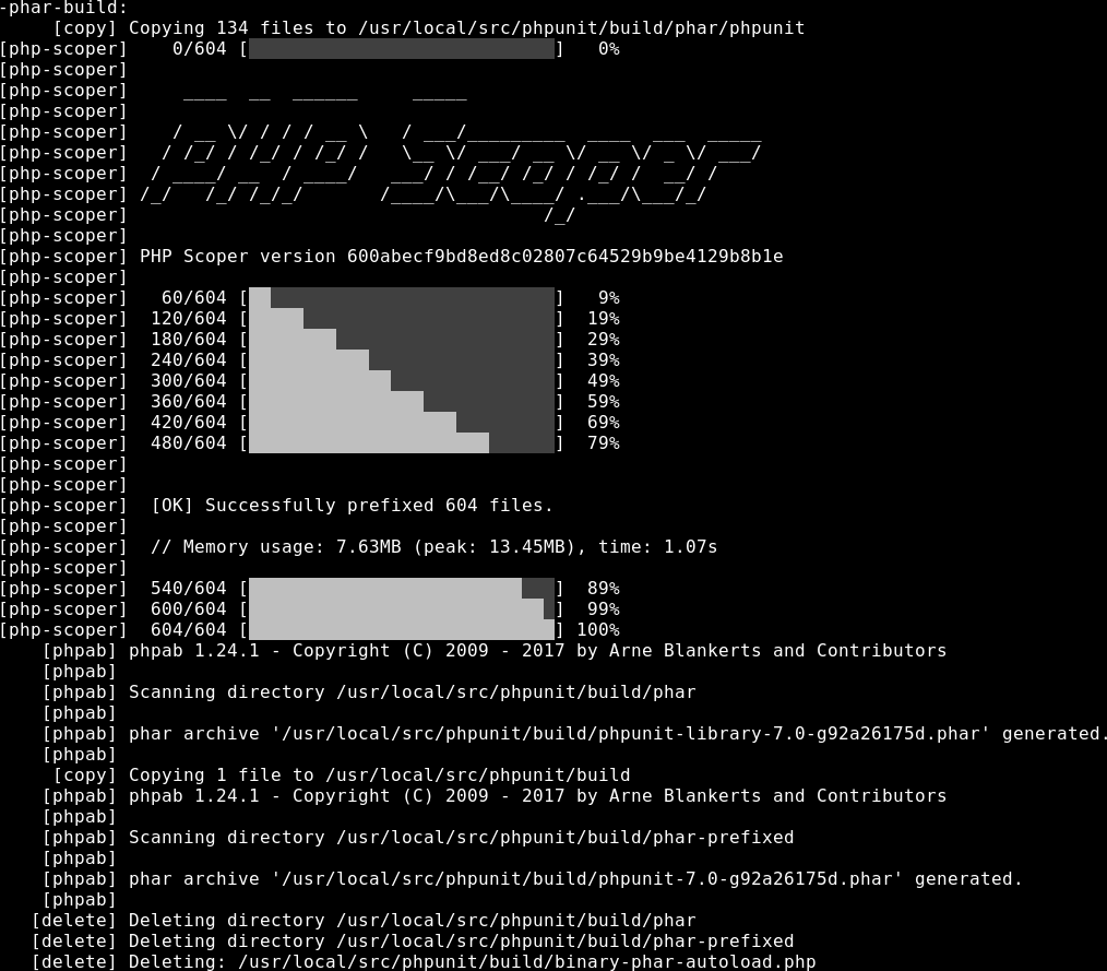 I am working on integrating php-scoper into the build process for phpunit.phar. Here is the current state of the relevant section from PHPUnit's build.xml: