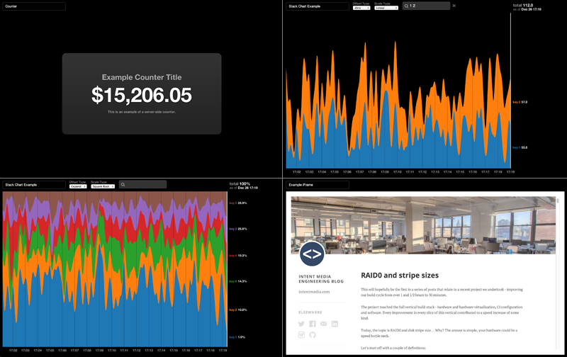 This was written to display real-time company metrics using portable hardware and a couple large plasma displays. We originally tried using Dashing, which is nice for displaying many simple data points on one page, but we wanted to display complicated data on many pages. Another major difference is that Dashing uses Ruby, Sinatra and Batman.js (and Coffeescript), whereas Dashboard.js uses Node, Express, and a custom JavaScript framework (and no Coffeescript).