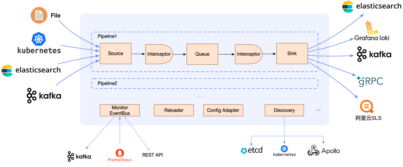 - Source: file, kafka, kubeEvent, grpc, elasticsearch, prometheusExporter..