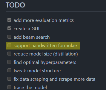 In fact, I want to make a handwriting formula recognition project, and I notice your todo list contains this part. Could there any possibilities that permit me to be a collaborator on this project and learn from you.😁 |