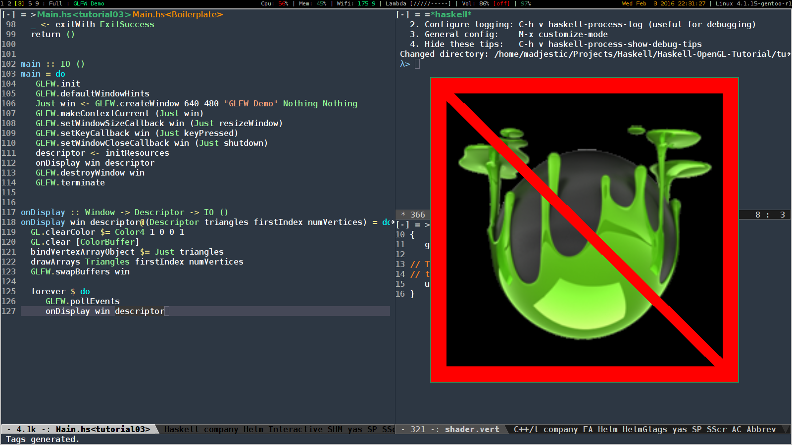 A simple OpenGL application, using FRP.Yampa to handle animation and user events, SDL2 for managing windows and input, stack as a build system.