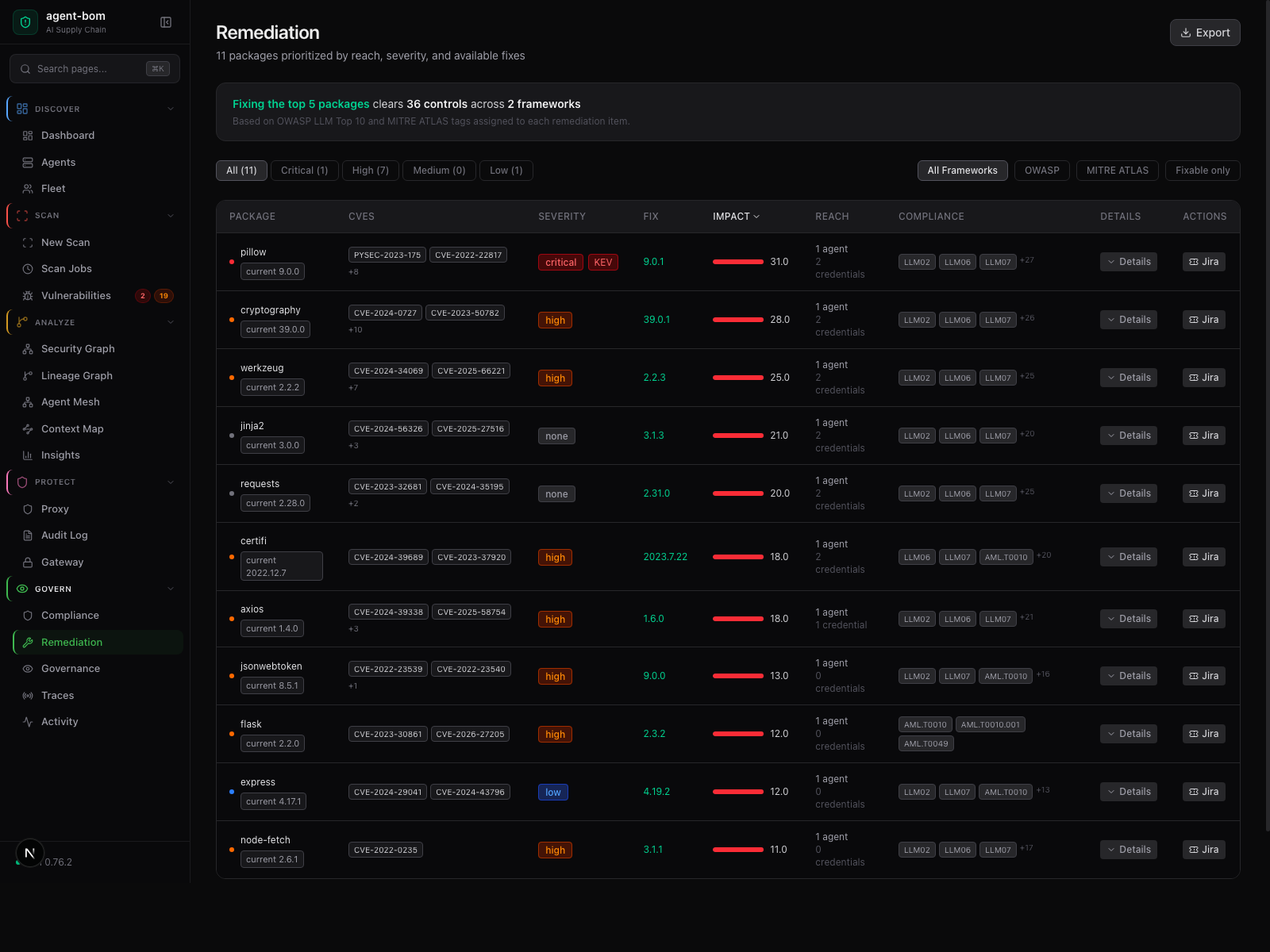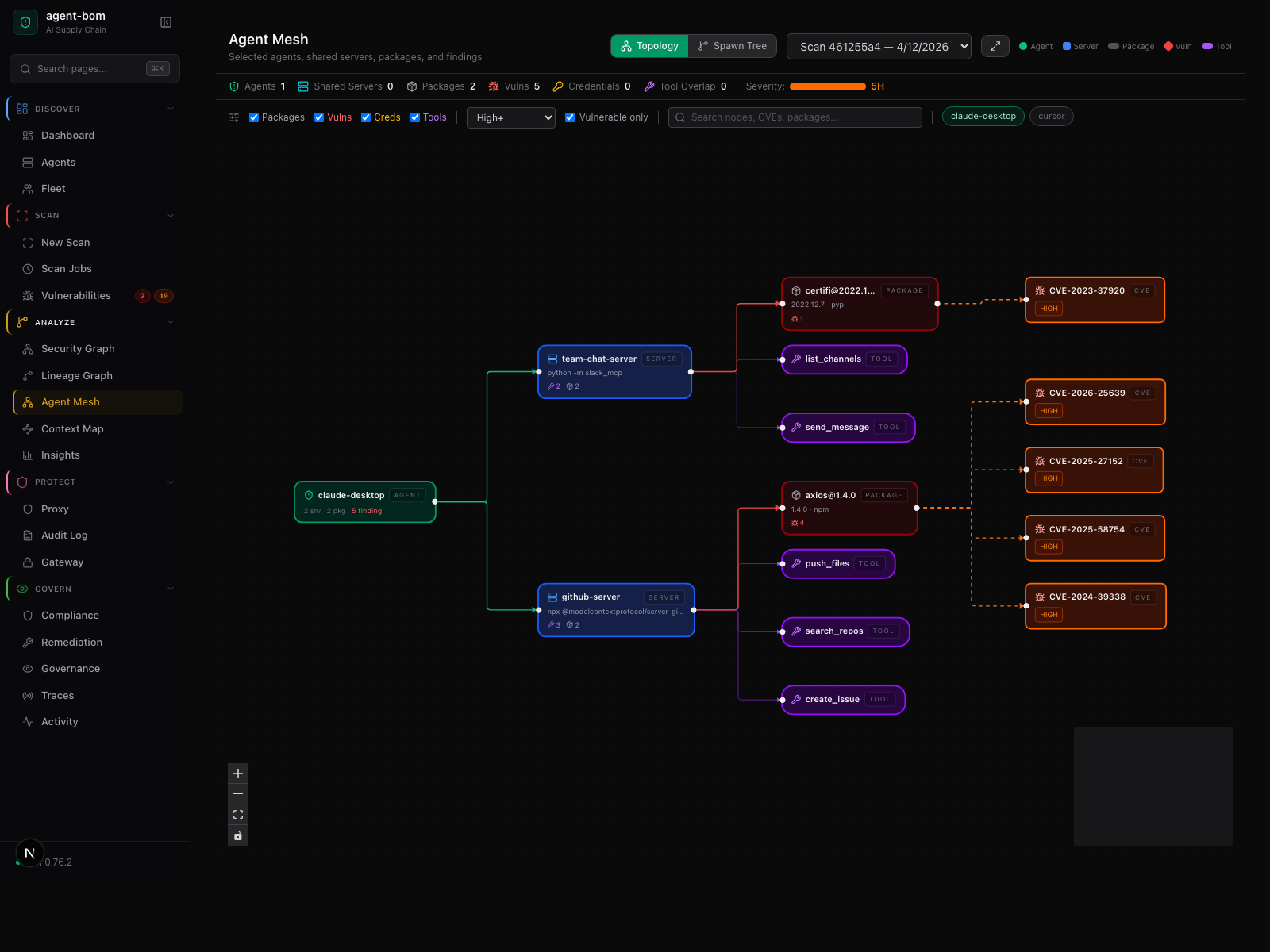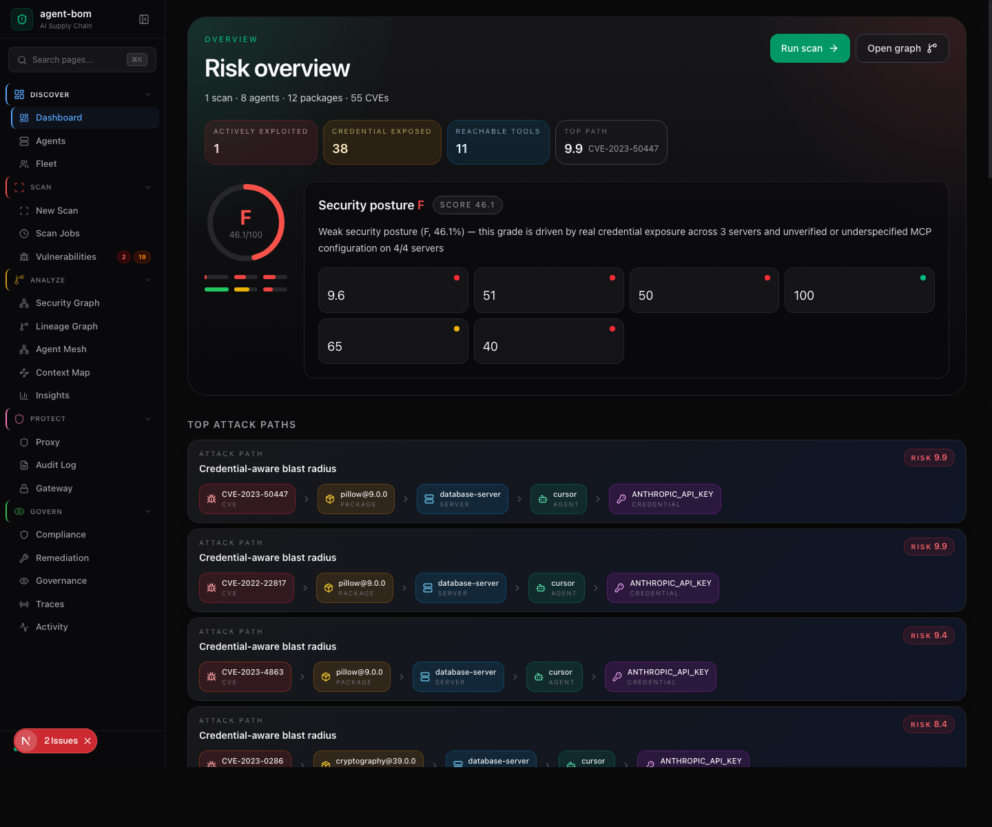 CVE -> package -> MCP server -> agent -> credentials -> tools - One operator path across CLI, CI, API, dashboard, remediation, and MCP tools