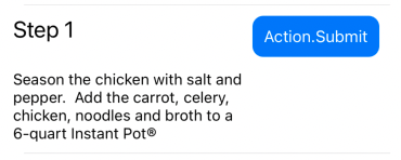 { "type": "AdaptiveCard", "$schema": "http://adaptivecards.io/schemas/adaptive-card.json", "version": "1.3", "body": [ { "type": "ColumnSet", "columns": [ { "type": "Column", "width": "stretch", "items": [ { "type": "RichTextBlock", "inlines": [ { "type": "TextRun", "text": "Step 1\n\n", "size": "large" }, { "type": "TextRun", "text": "Season the chicken with salt and pepper. Add the carrot, celery, chicken, noodles and broth to a 6-quart Instant Pot®", "wrap": true } ] } ] }, { "type": "Column", "width": "auto", "items": [ { "type": "ActionSet", "actions": [ { "type": "Action.Submit", "title": "Action.Submit" } ] } ] } ] } ] }How Verified