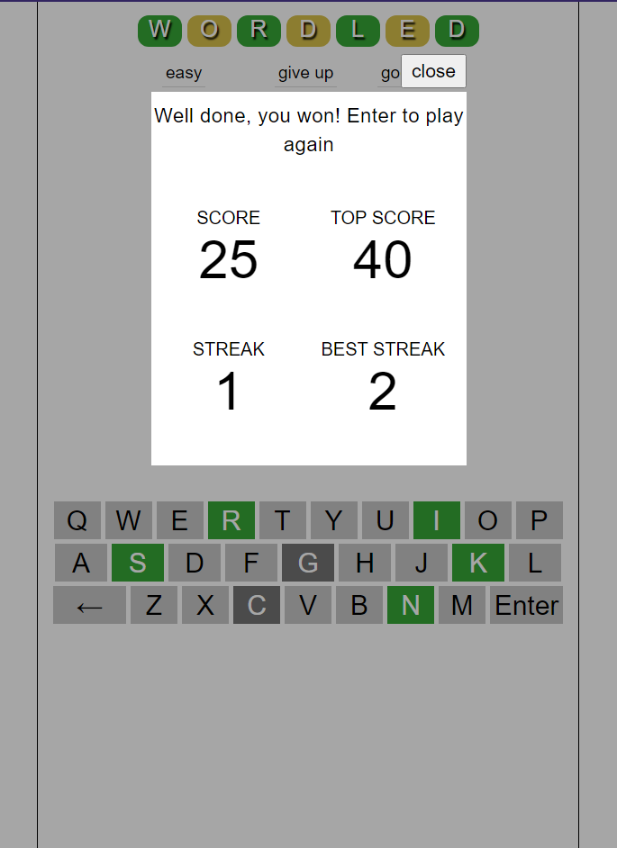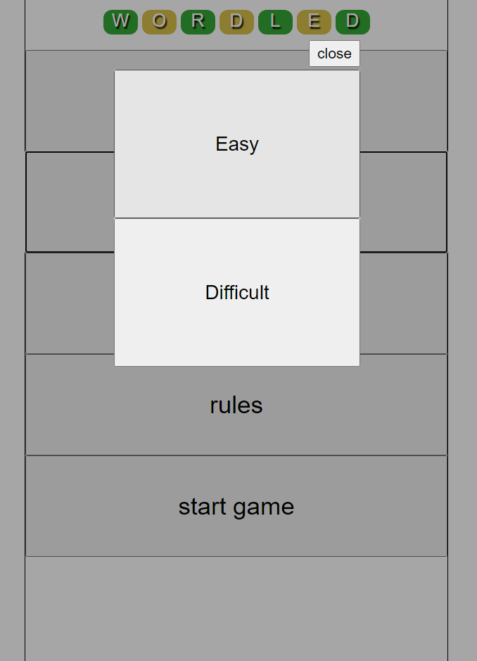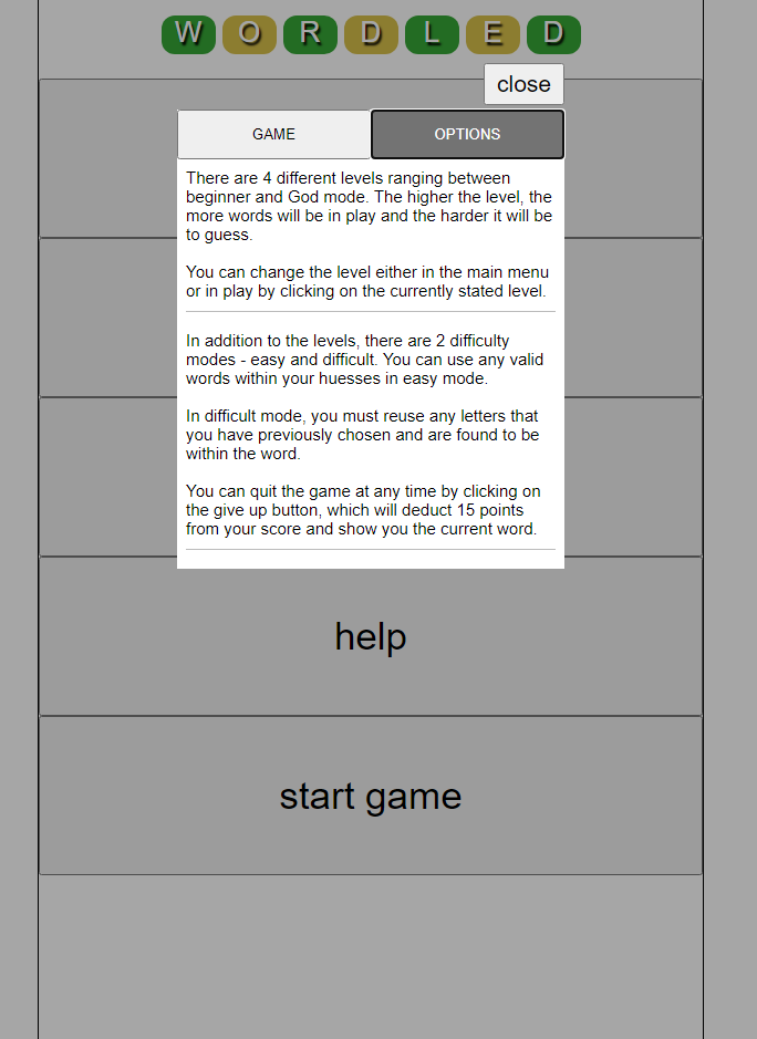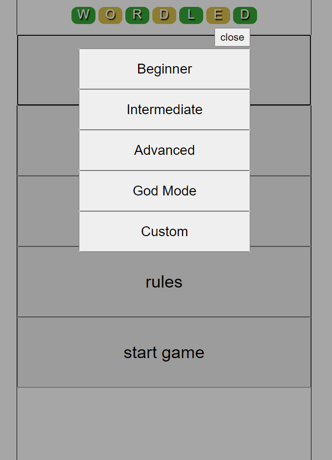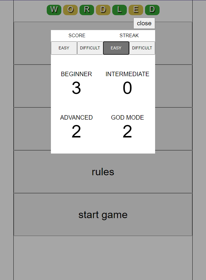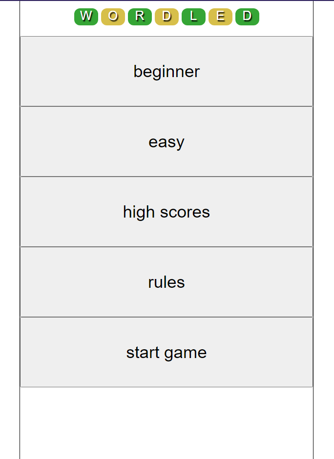 I've updated the game to include scores, multiple level and difficulty choice and a start up menu which includes access to high scores, best streaks, instructions and difficulty/level changes. I've also included a few animations and modals for the notifications as well as added in some responsive design. It can also be demoed in full online at wordled.online <https://wordled.online/>