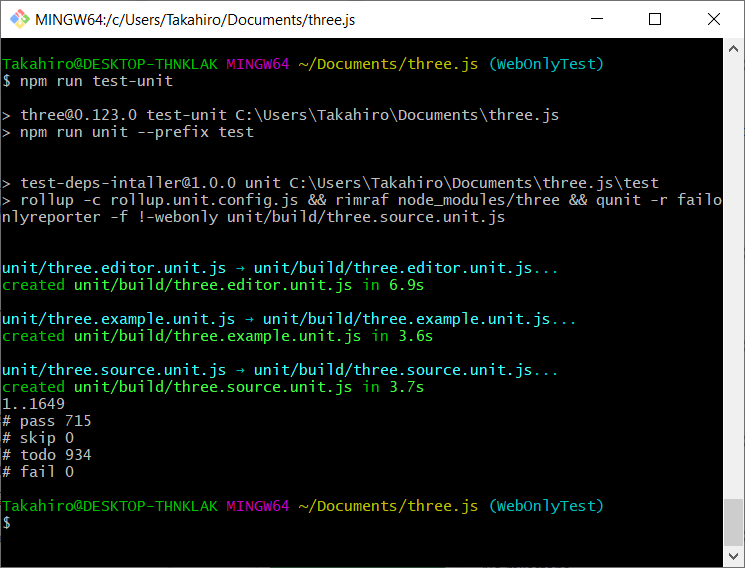 WebGLRendererinstantiation test as an example in this PR.new WebGLRenderer()doesn't work as is on Node.js because it has a dependency withdocument.The following two screenshots show that the tests pass on both Node.js and Web although the