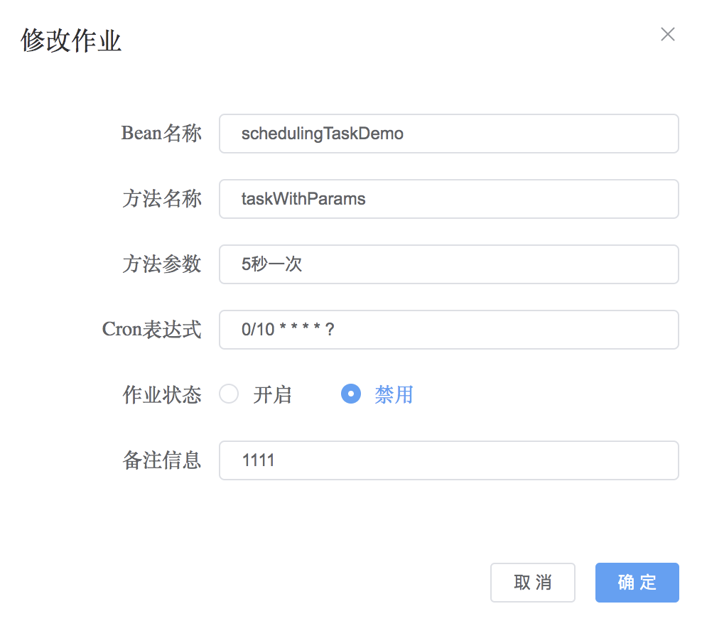 - 作业状态:开启和禁用两种。开启的话,添加完成后这个定时任务就会开始执行,禁用的话,就单纯只是将记录添加到数据库中。