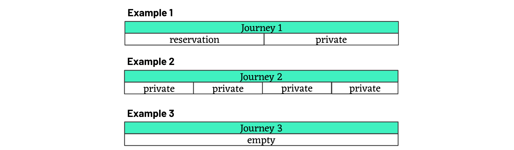 - Example 1: customer makes a reservation and company delivers vehicle to customer, then one trip point-to-point by customer, ending reservation at destination