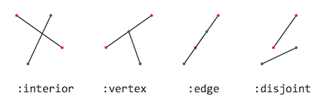 :interior- the segments intersect at a point that is interior to both:vertex- the segments intersect at an endpoint of one or both segments:edge- the segments are parallel, collinear, and overlap for some non-zero length:disjoint- no intersection exists between the two segments