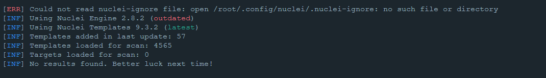 Hello @dotfy, I wonder if you've managed to figure out what the issue was. Normally nuclei updates that file automatically. At this point in time nuclei looks for the  If you execute nuclei with both normal user and administrative privileges, with the default configuration, it will create the configuration directory for both users. (Please note that nuclei doesn't require administrative privileges) You can try to remove the configuration directory altogether and re-try the execution. Alternatively, you can also try manually download it from here and placing it under one of the above mentioned locations, but make sure to provide the right permissions.  |