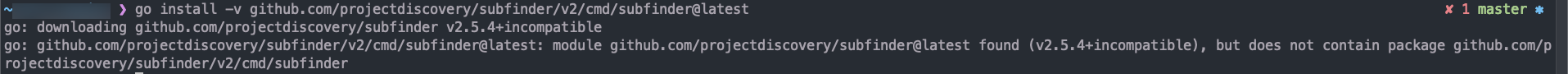 go: github.com/projectdiscovery/subfinder/v2/cmd/subfinder@latest: module github.com/projectdiscovery/subfinder@latest found (v2.5.4+incompatible), but does not contain package github.com/projectdiscovery/subfinder/v2/cmd/subfinder