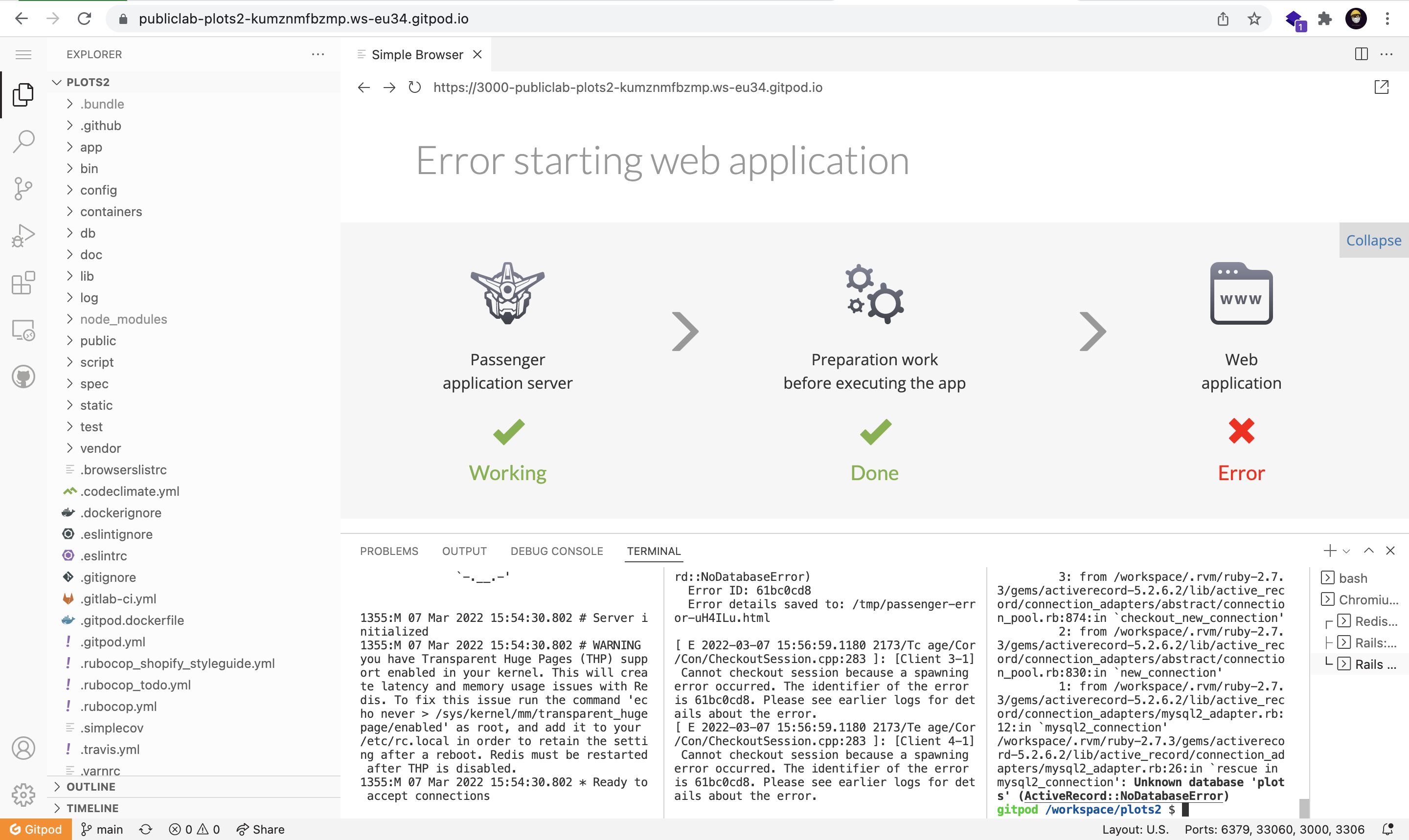 Hi Paul, oh no! Ok, but so you can probably fix it the same way too. Use a link like this: https://gitpod.io/#prebuild/https://github.com/publiclab/plots2/ That forces a fresh prebuild, so starting from an earlier stage than had generated your error. |
