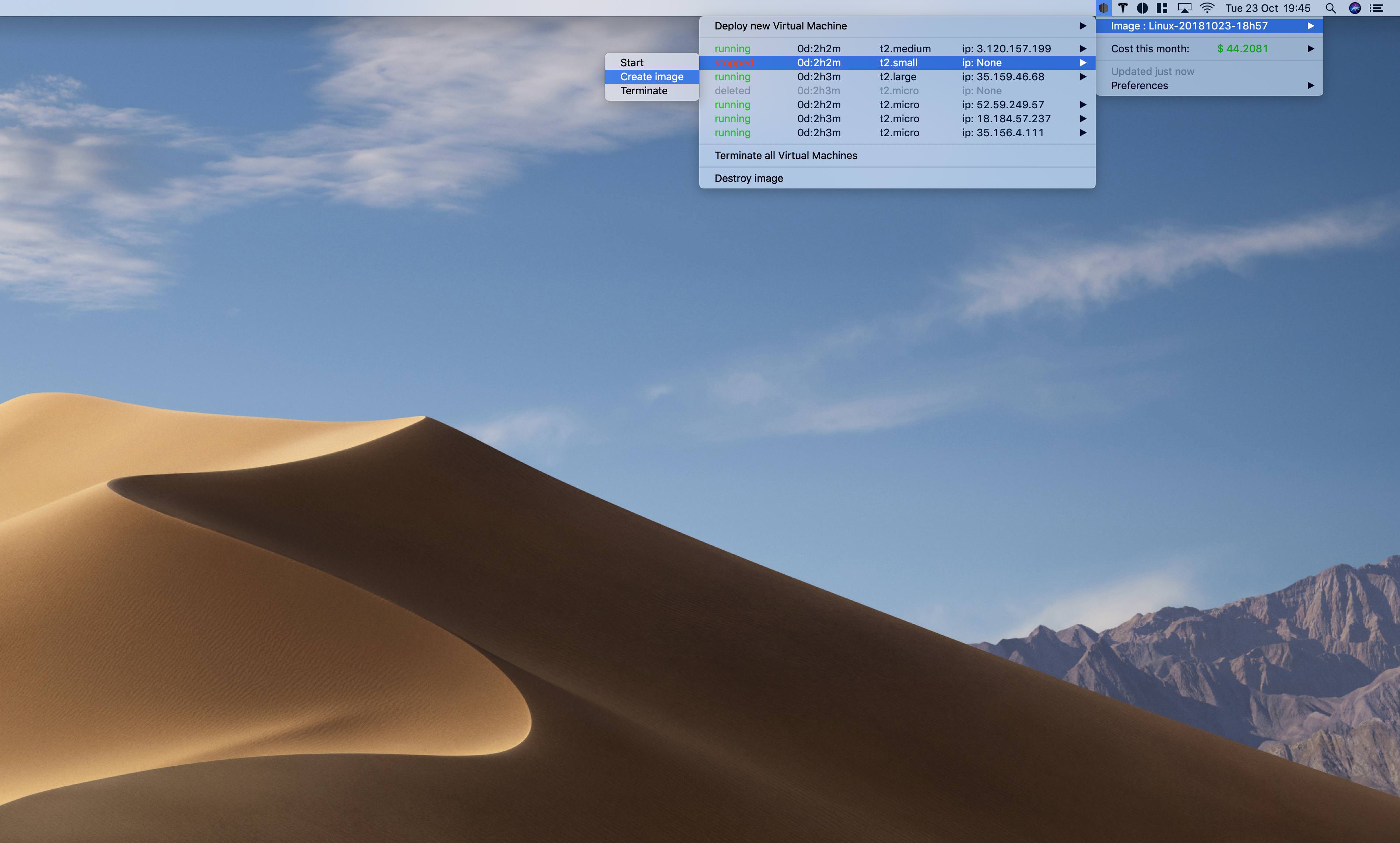 Displays information regarding your AWS EC2 virtual machines in the MacOS menubar. Allows you to create, connect to and terminate EC2 virtual machines. Create and destroy EC2 images from virtual machines. Check storage consumption