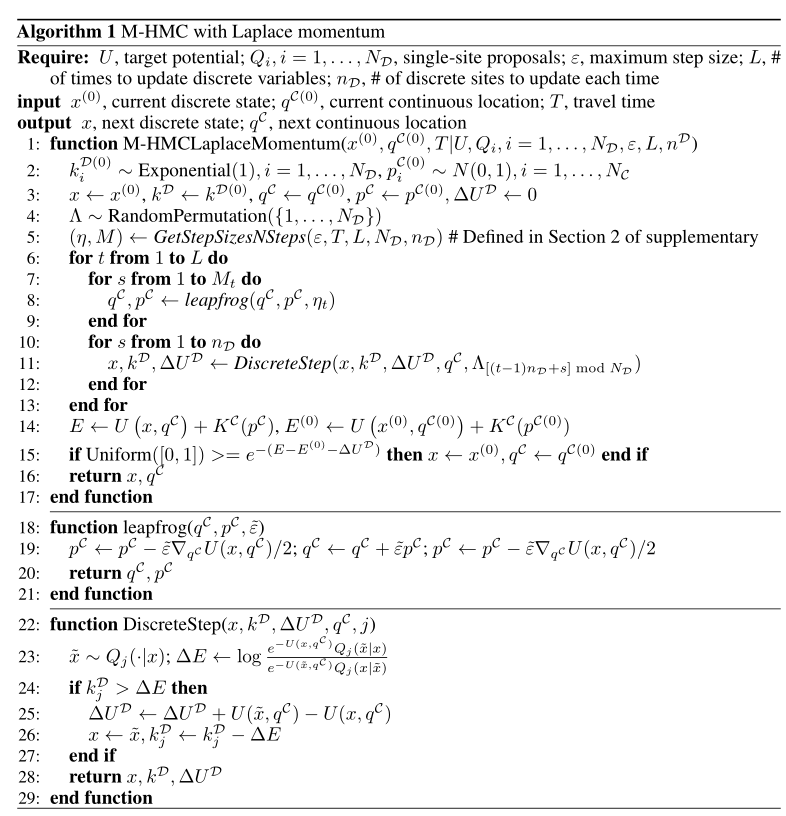 Agreed about the periodicity case. I basically made a technical assumption when proving correctness. Your comments led me to think there might be mess-ups in my cancellation reasonings in the proof which led to the seemingly incorrect final correction. I'm looking into this point. I see your point about taking the continuous part as a discrete variable. That's very interesting, and sounds similar but slightly different from what I'm thinking (and what I had in the paper). To make sure I understand, you specify an auxiliary kinetic energy for the continuous part of the system, then after each continuous Hamiltonian dynamics step you calculate the energy difference and decide whether you accept/reject based on whether you have enough kinetic energy? |