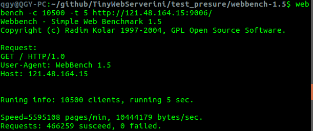 注意: 使用本项目的webbench进行压测时,若报错显示webbench命令找不到,将可执行文件webbench删除后,重新编译即可。