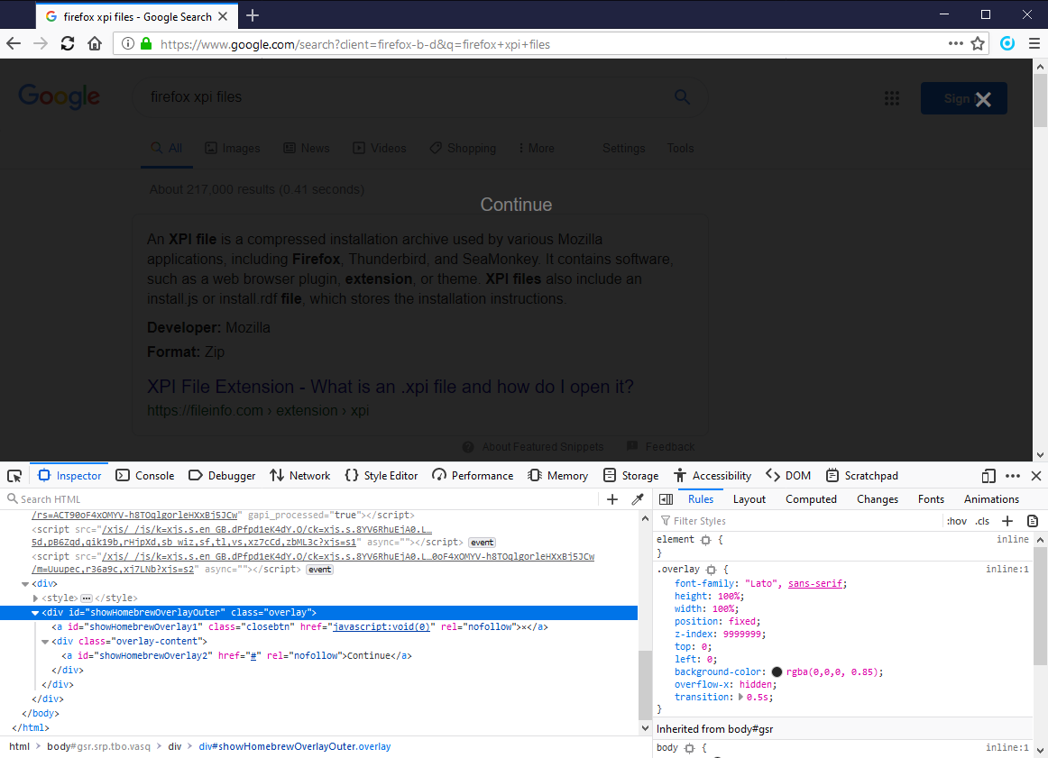 Each extension XPI file was then extracted and examined. However, grepping through every extension's source scripts did not return any results for "homebrew". I moved to examining each extension manually. Here, I noticed the odd bg.js and content.js scripts with seemingly innocuous functions unrelated to the extension's supposed functionality. I also noticed the loading of cross.png. Viewing this file in a hex editor immediately revealed the added payload.