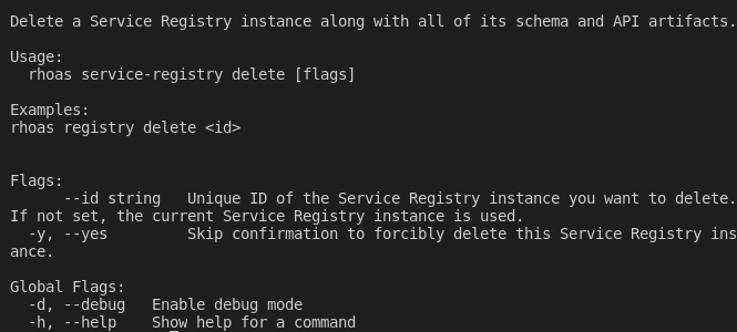 ## Description Certain examples have references to old command `registry` instead of new command `service-registry`.  ### Steps to reproduce Add the steps required to reproduce this error. 1. Run the command `./rhoas service-registry -h`