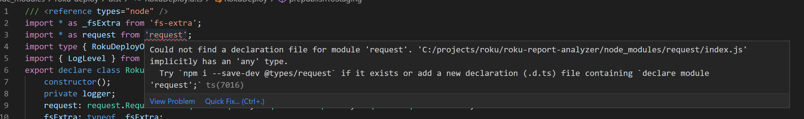 Importing roku-deploy into a typescript project sometimes shows type errors because of a missing