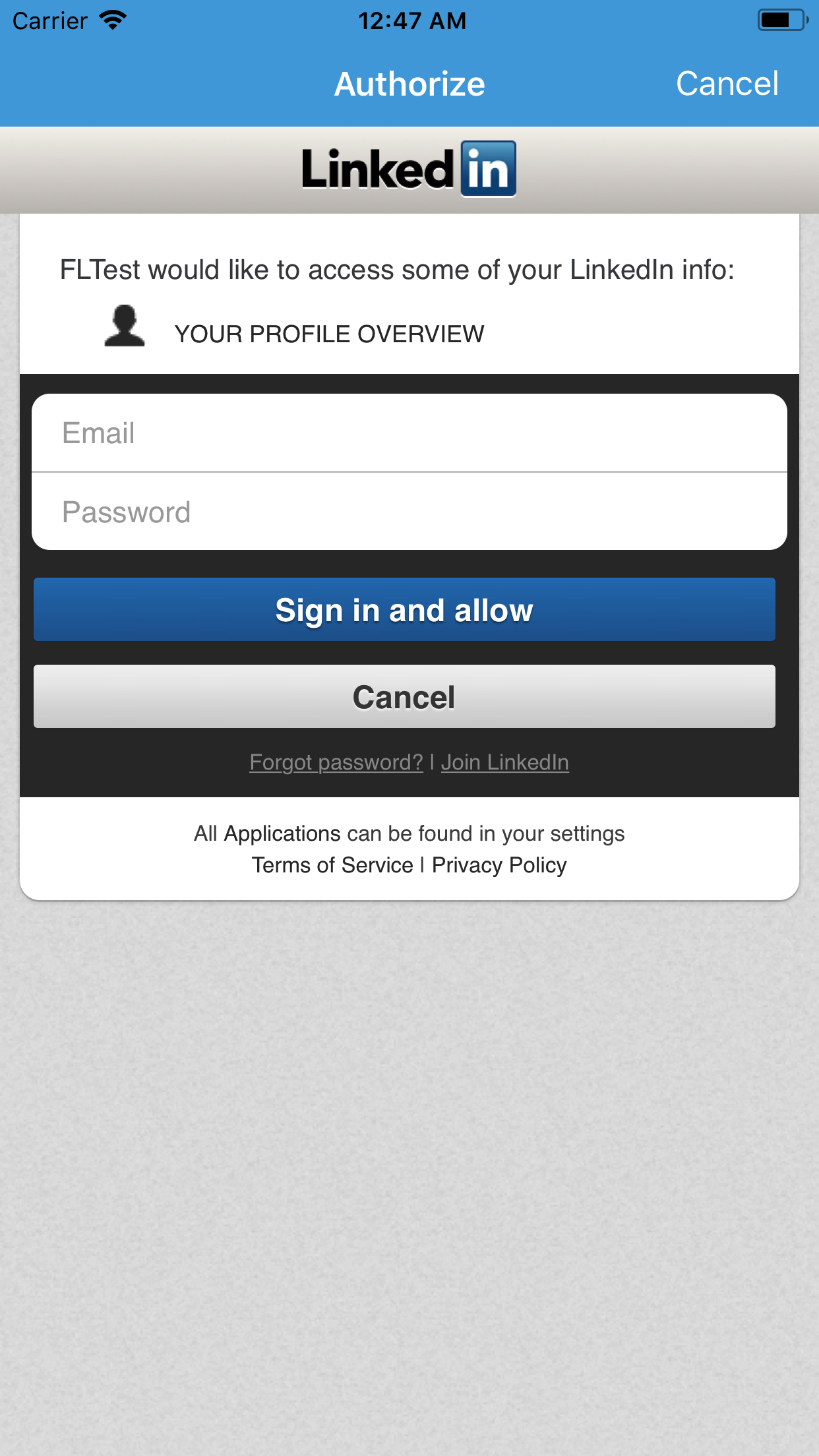 }LinkedInSignIn is available through CocoaPods. To install it, simply add the following line to your Podfile: