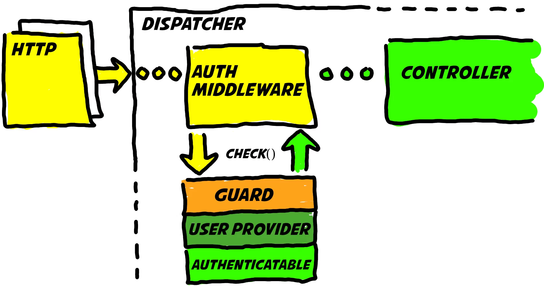 Система аутентификации имеет такие понятия как «Охранники» (Guard) и «Поставщики» (Provider), охранники определяют, как пользователи будут аутентифицироваться, например, используя стандартные Хранилища Сессии и файлов куки.
