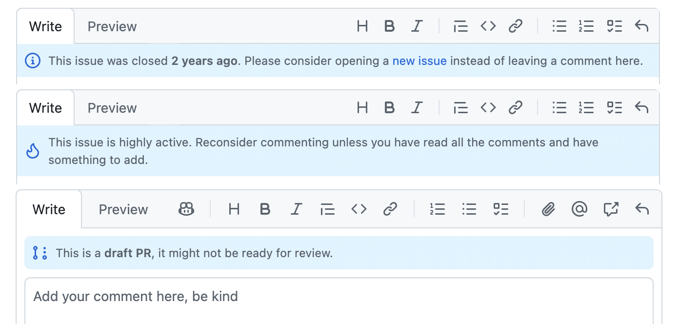 - Adds unobtrusive netiquette reminders (old closed issues, highly-active issues, draft PRs, …).