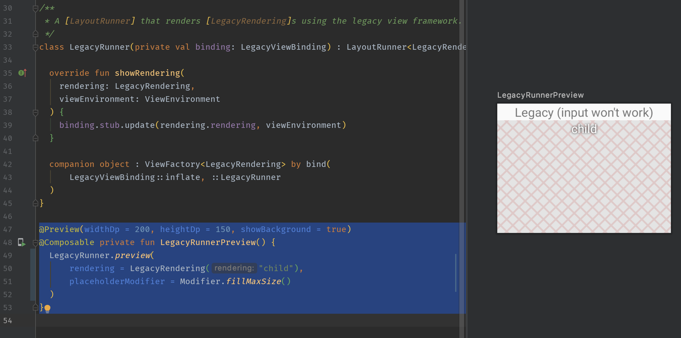 ViewFactorys, both those implemented with Compose and legacy ones usingLayoutRunners or literally anything that implements theViewFactoryinterface.Preview complicated containers
