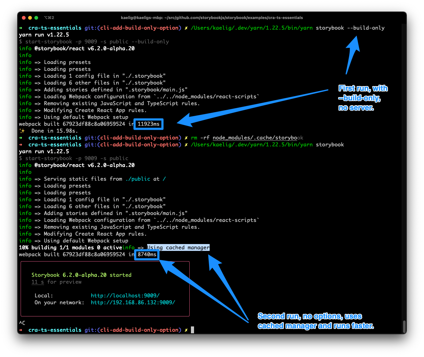 yarn bootstrapran successfully,cd examples/cra-ts-examplesrm -rf node_modules/.cache/storybookyarn start-storybook --build-only: should exit without opening a browseryarn start-storybook: should run faster