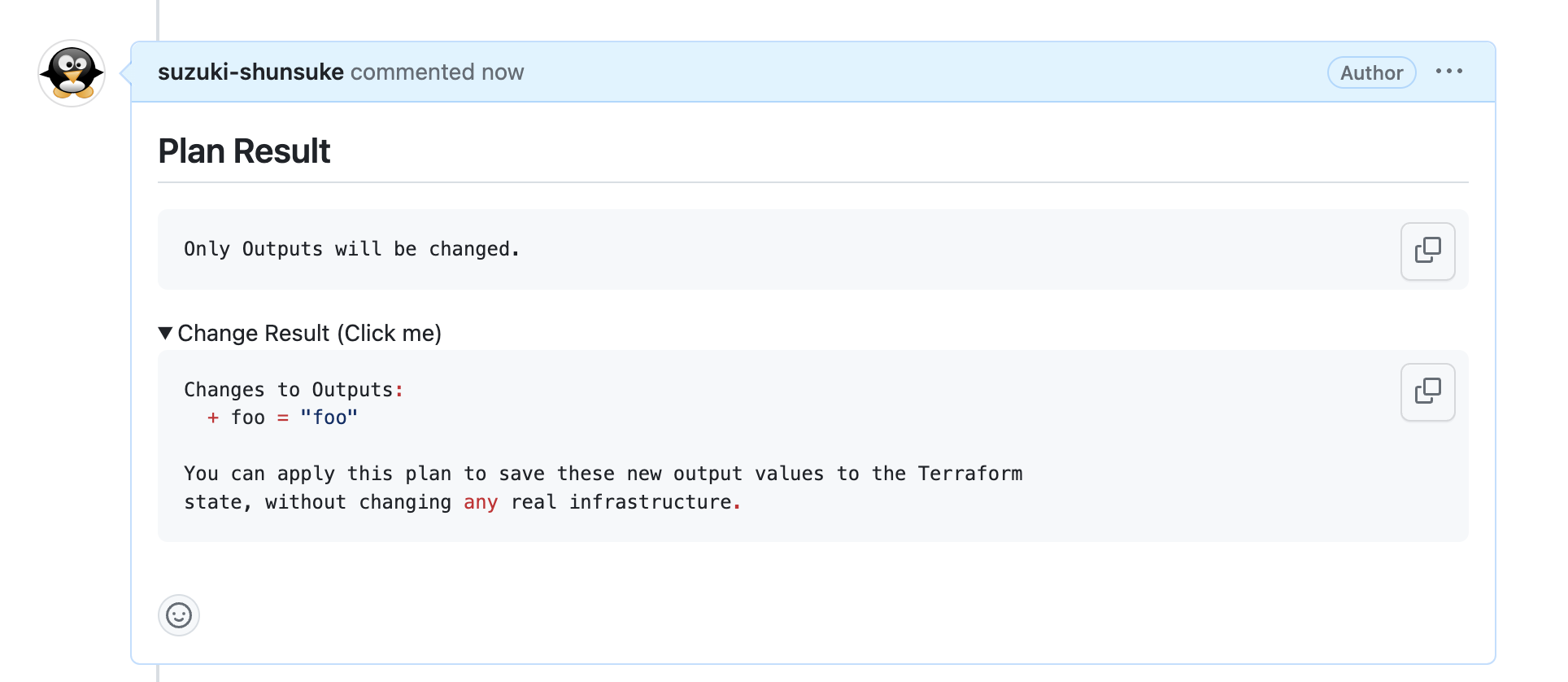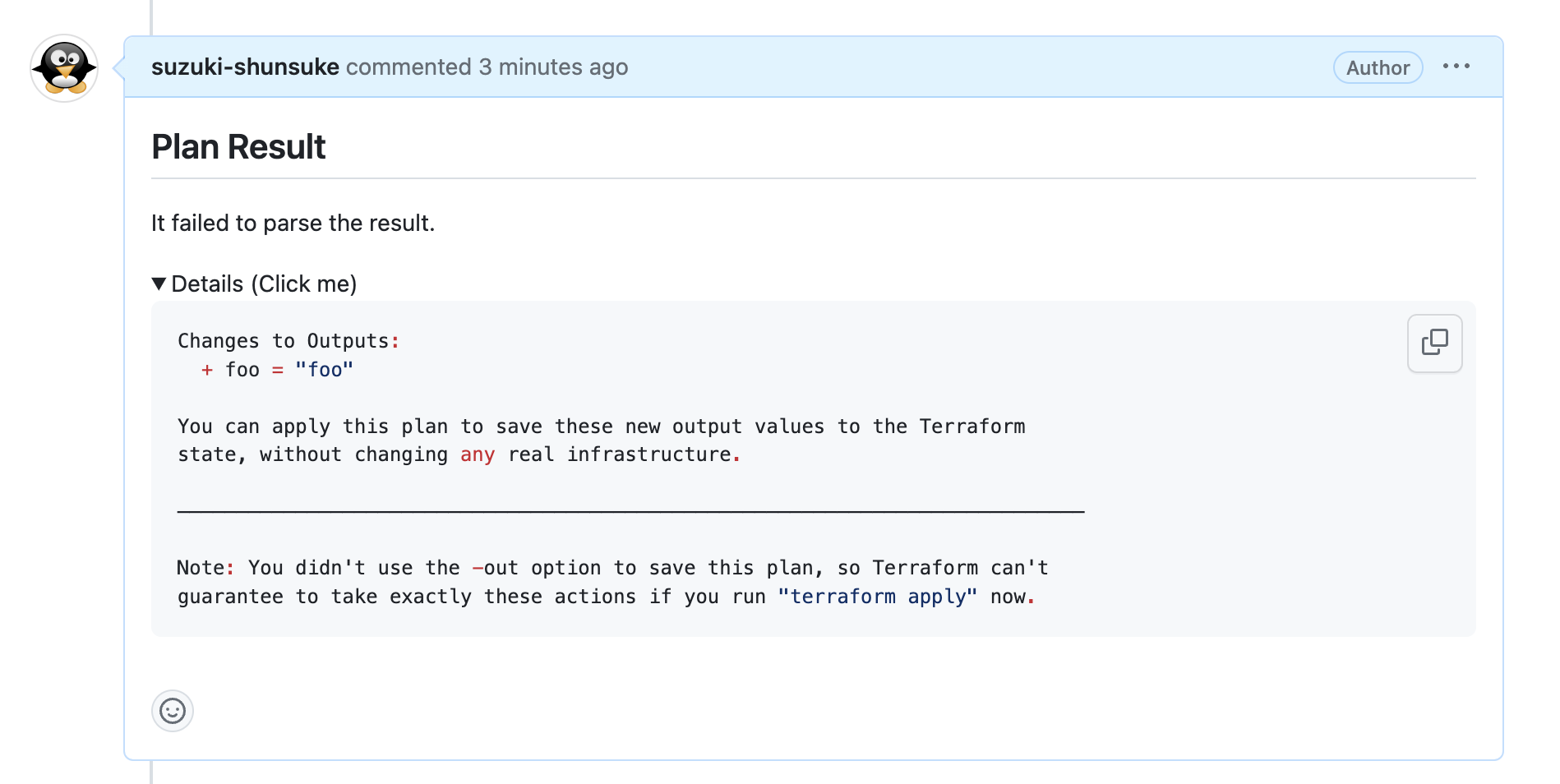 guarantee to take exactly these actions if you run "terraform apply" now.As of tfcmt v4.5.1, tfcmt can parse the output properly.