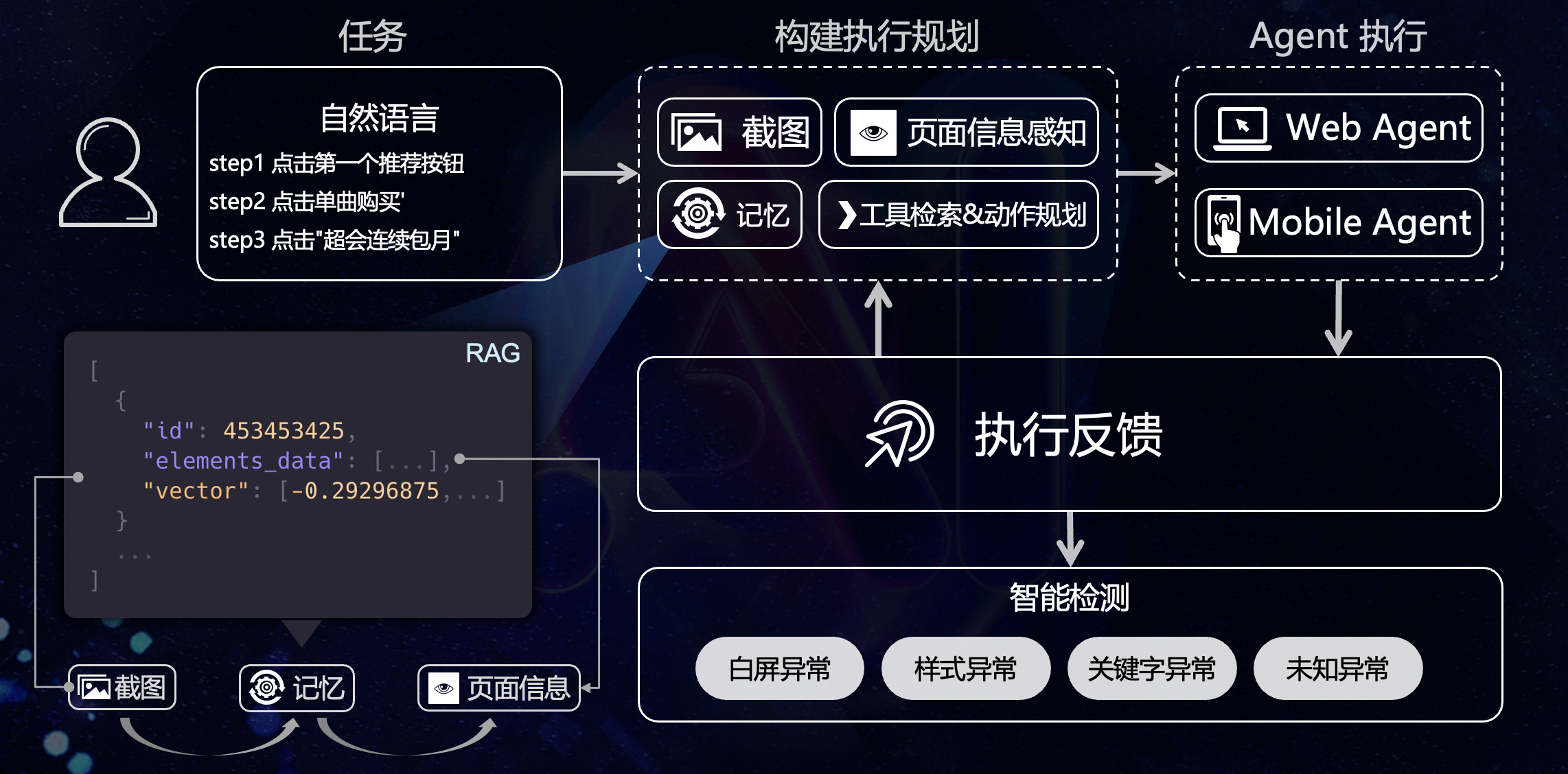 PageEyes Agent 是基于 Pydantic AI 框架开发的一个轻量级 UI Agent, 其中元素信息感知能力依靠 OmniParserV2 模型,整个 Agent 的优势在于不依赖视觉语言大模型, 即使小参数的 LLM 也能胜任路径规划能力,同时支持多平台(Web、Android),目前主要包含以下功能: