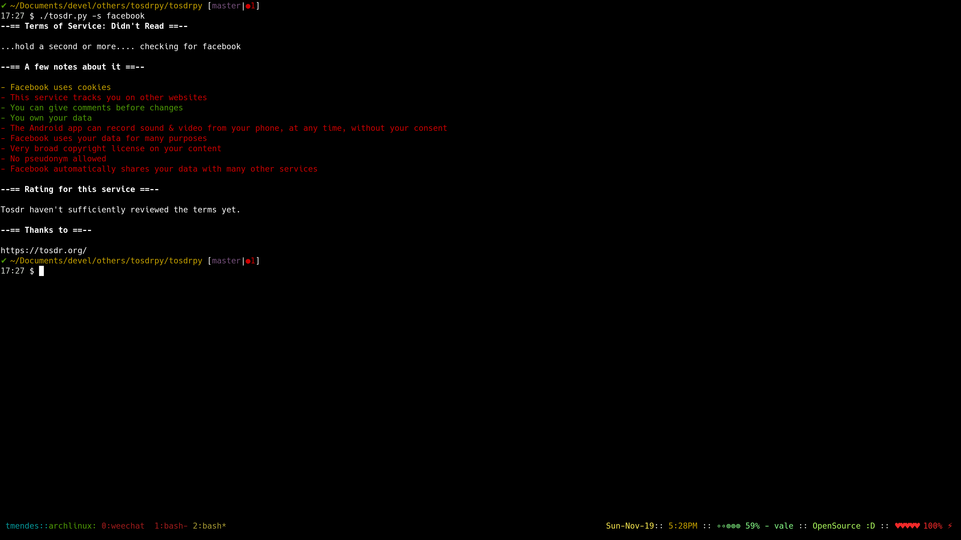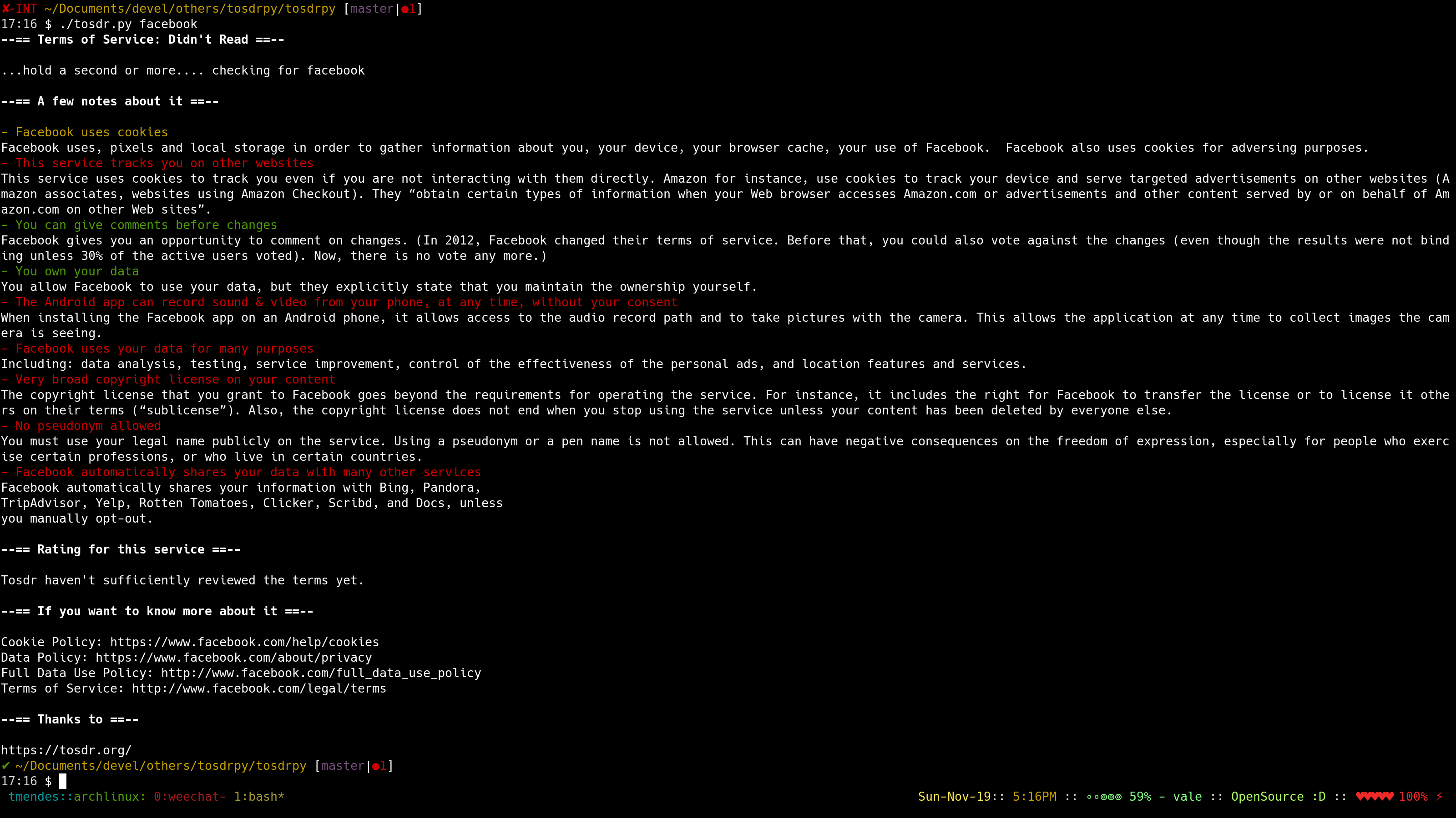 It will bring just topics about the Facebook's terms of use resumed by the tosdr's team