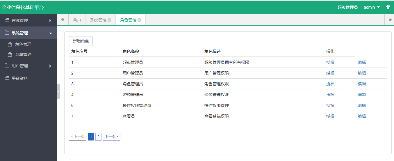 - 角色管理: 按照企业系统职能进行角色分配,每个角色具有不同的系统操作权限