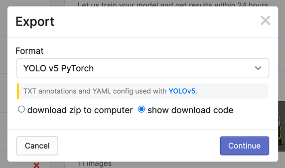 Export in YOLOv5 Pytorch format, then copy the snippet into your training