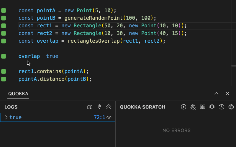 Quokka.js is a rapid prototyping playground for JavaScript and TypeScript. It runs your code immediately as you type and displays various execution results in your code editor.