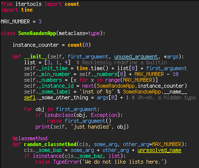 Different highlighting of locals, globals, imports, used and unused function parameters, builtins, attributes, free and unresolved names.