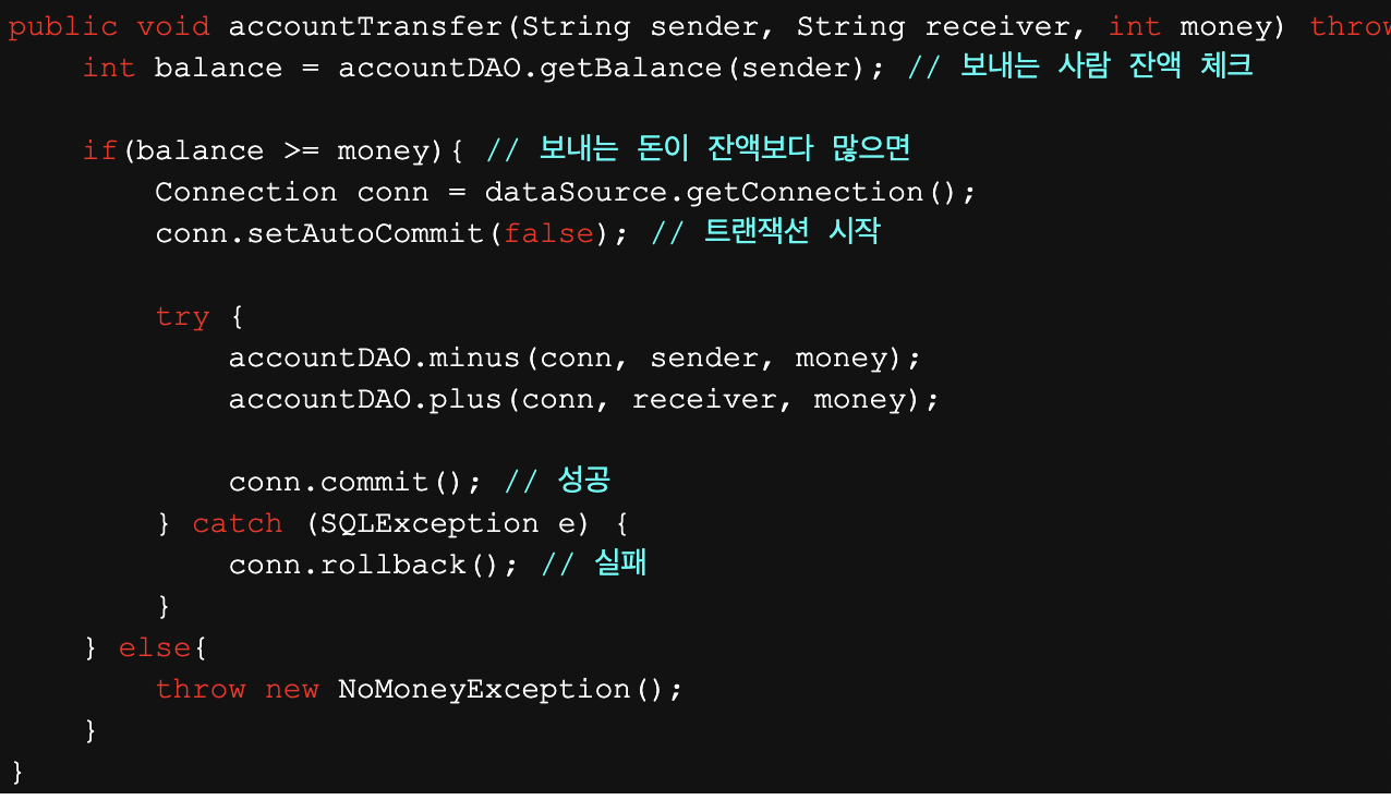 }이런 경우면 execute()에서 setAutoCommit(false)를 해줘도 각 jdbcTemplate.update() 메서드 별로 하나씩 execute()가 실행될 것 같기 때문에 결국 method() 전체가 트랜잭션으로 묶이지 않고, 각 update()별(1, 2, 3)로 각각 트랜잭션이 묶일 것 같아요! 그래서 setAutoCommit(true)해준 것과 같은 효과를 볼 것 같다는 생각이 들어요!